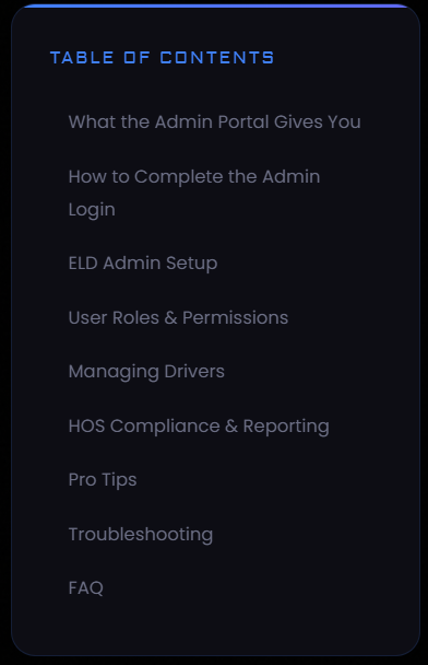 Set up 2FA on every admin account before anything else. Assign roles carefully and limit super admin access to the people who genuinely need it. Configure compliance alerts so problems surface before they become fines. And when you onboard new drivers, confirm the HOS rule set before their first trip goes on record.